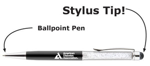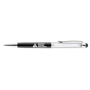 American Diabetes Association logo pen with a black barrel and sparkling crystal-filled cap. This twist-action ballpoint pen features a rubber stylus tip on top. Approximately 5.5" in length.