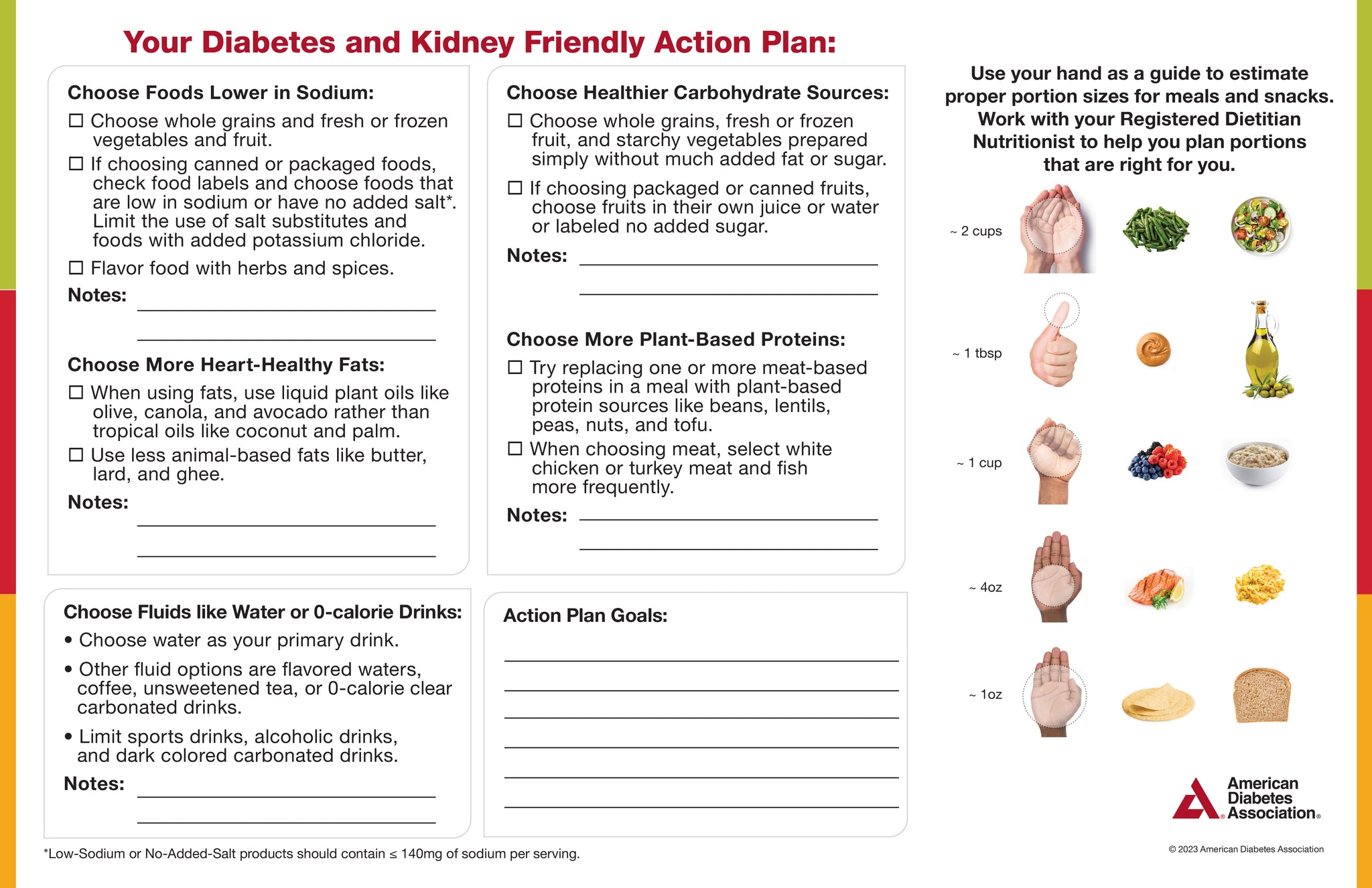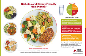 The Diabetes- and Kidney-Friendly Meal Planner is a simple guide to planning meals and managing portions for people with diabetes and chronic kidney disease. This meal planning guide was developed for individuals who are not on dialysis. Sample dishes displayed are commonly consumed in the U.S. and are culturally diverse, budget-friendly, and emphasize plant-based eating options. The back side of the placemat provides simple tips for meal planning based on the latest nutrition guidelines and tools for estimating portions. Made in the USA. Full colored graphics, double-sided, 11" x 17" laminated placemat.