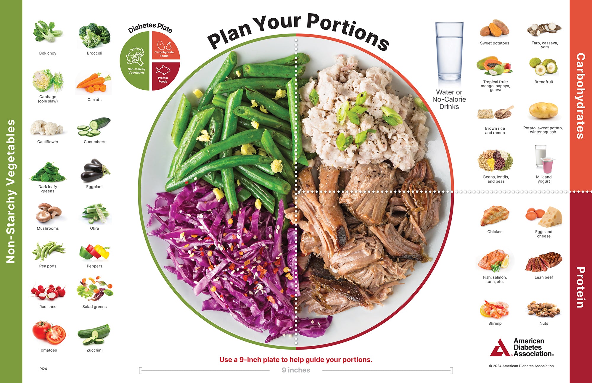 The diabetes placemat is a simple guide to planning meals and managing portions. Sample dish shows Pacific Islander cuisine. The back side of the placemat provides simple tools for estimating portions. Made in USA. Full colored graphics, double-sided, 11" x 17" laminated placemat.