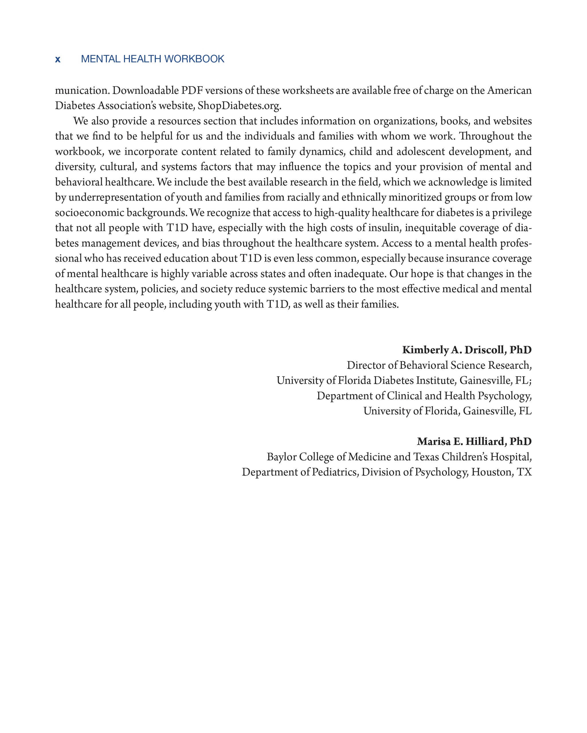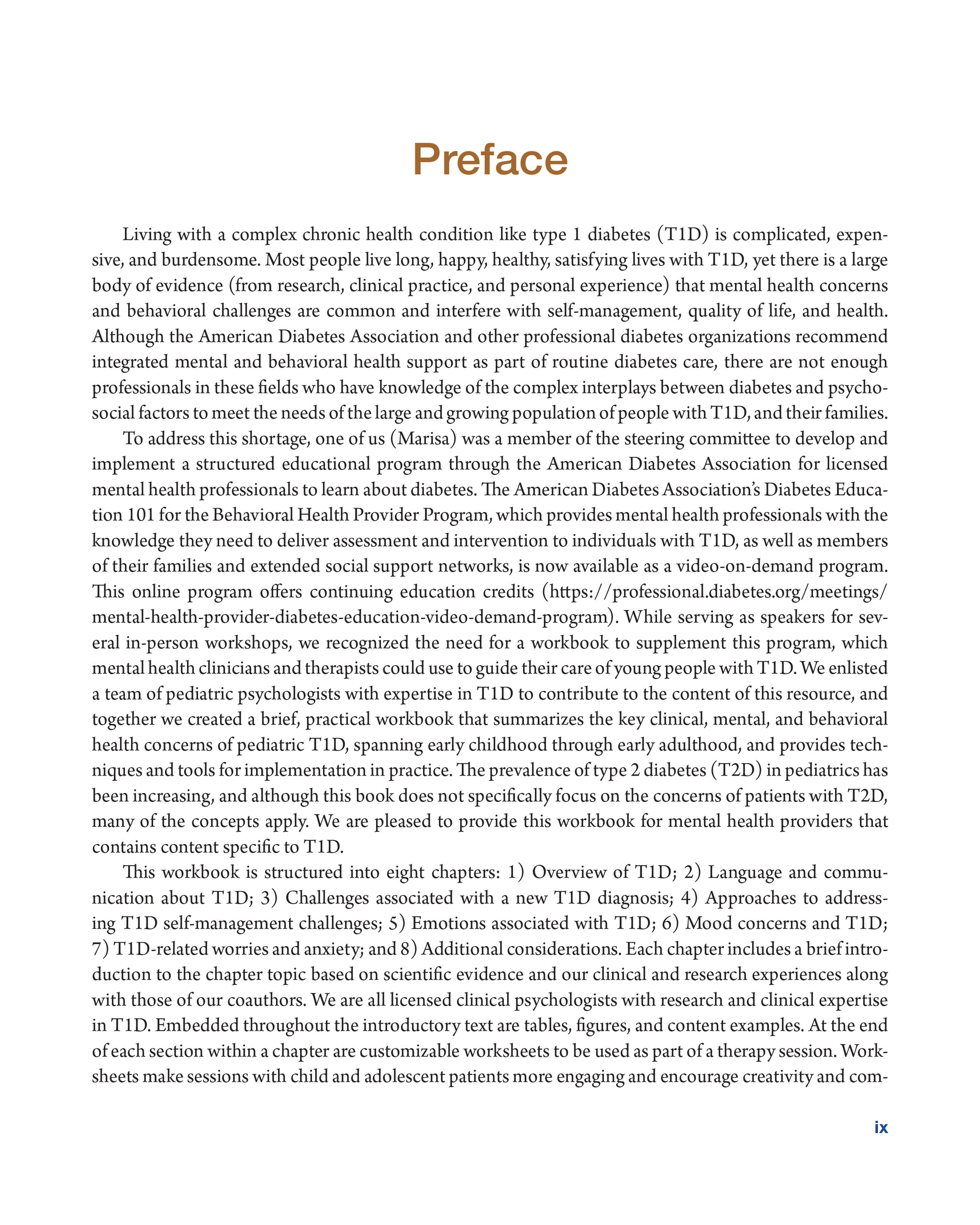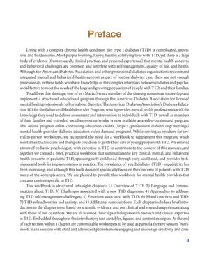 Most people live long, happy, healthy, and satisfying lives with T1D, yet there is a large body of evidence that mental health concerns and behavioral challenges are common, and interfere with self-management, quality of life, and health. The Type 1 Diabetes Mental Health Workbook was created to provide a concise, practical resource for mental health clinicians and therapists to use in their care of young people with T1D.